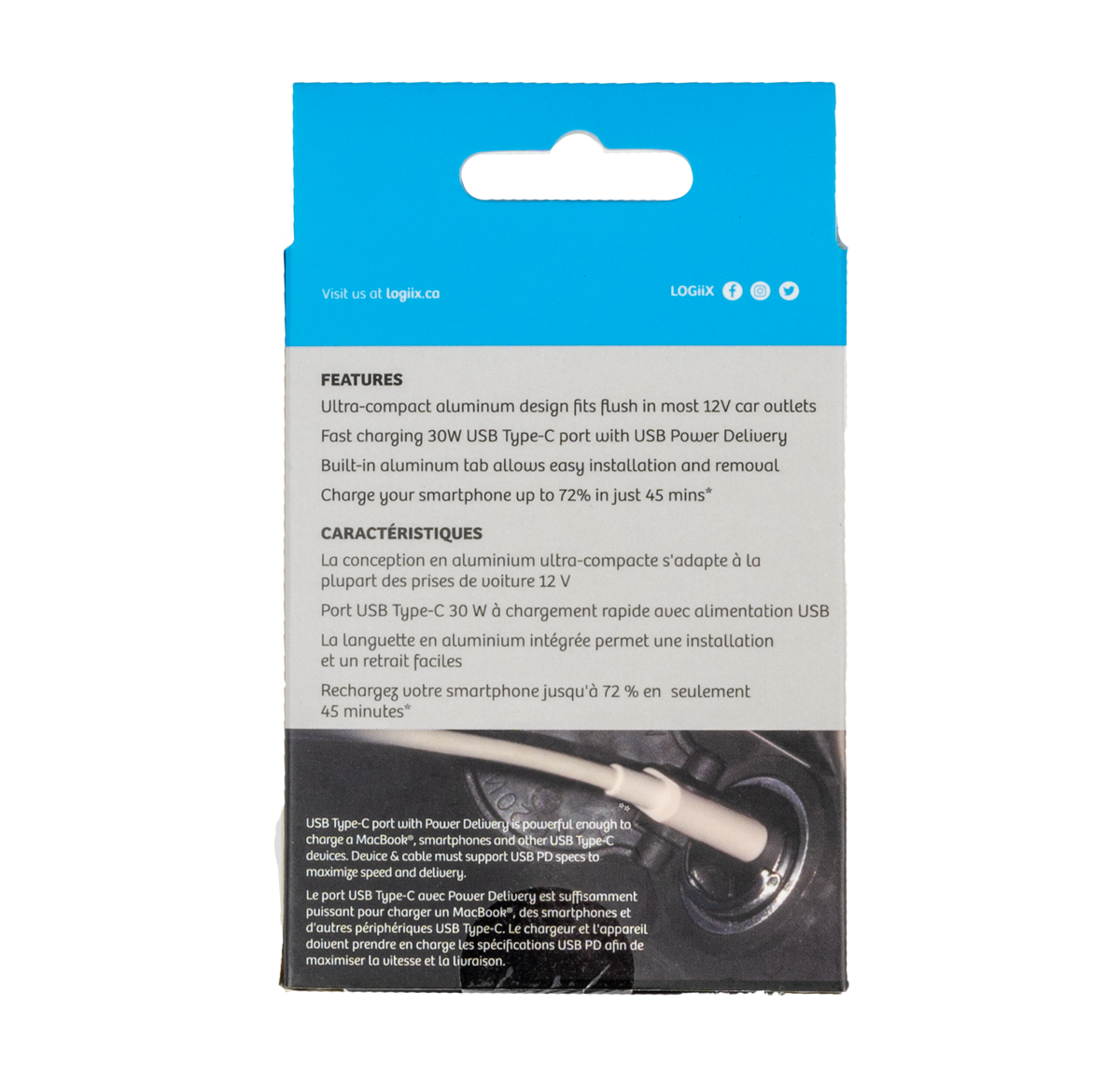 The LOGiiX Power Lite Compact 30 is a low profile car charger that fits into any 12V in-car plug. Perfect for roadtrips, this car charger is capable of charging your device up to 72% in just 45 minutes with the USB Type-C power delivery port. This ultra-small charger comes with a built-in aluminum tab that allows for easy installation and removal.