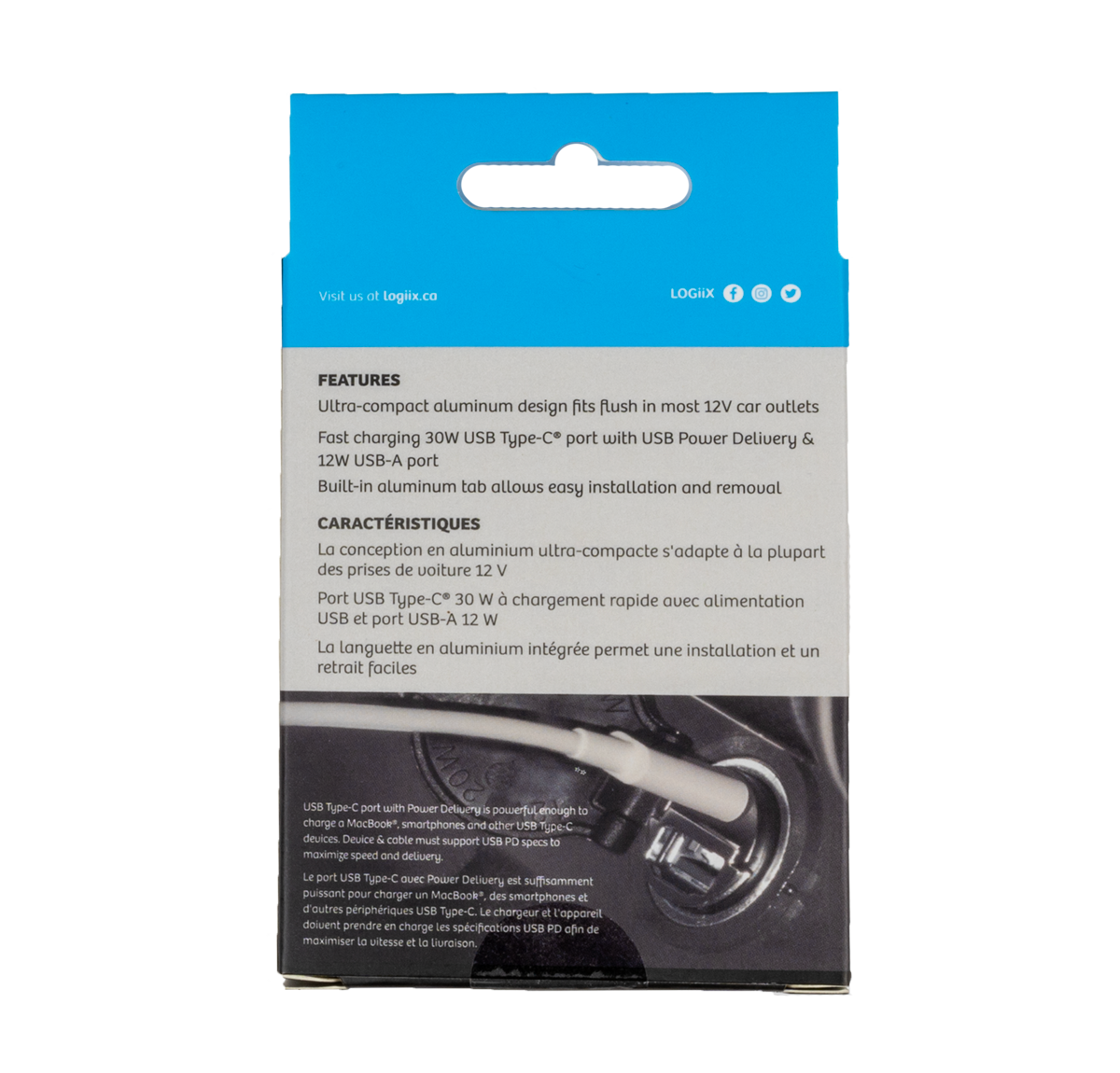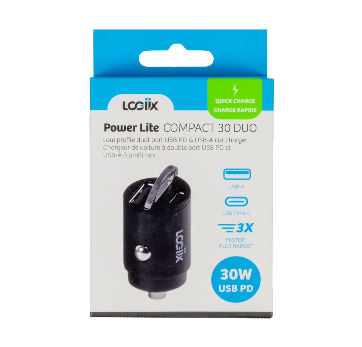 The LOGiiX Power Lite Compact 30 Duo is a low profile dual port car charger that fits into any 12V in-car plug. Perfect for roadtrips, this car charger is capable of charging your device up to 72% in just 45 minutes with the USB Type-C power delivery port. This ultra-small car charger comes with a built-in aluminum tab that allows for easy installation and removal. The Power Lite Compact 30 Duo features a single USB Type-C Power Delivery port along with an additional fast-charging USB-A port, ensuring that you can fast charge up to 2 devices at once!