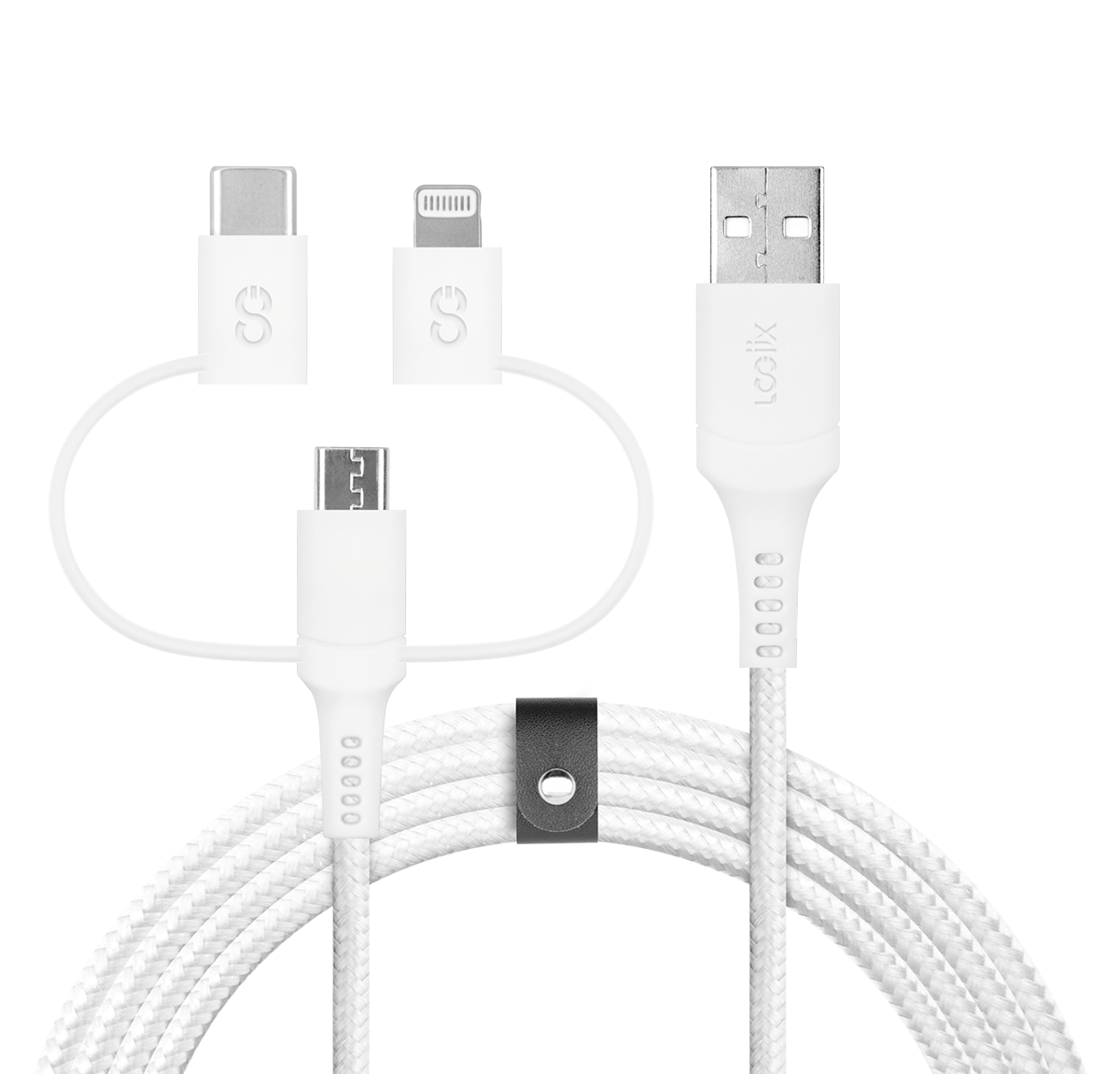 El multicable LOGiiX 3 en 1 cuenta con un USB-A de 1,5 M a Lightning, MicroUSB y USB Type-C y es un cable ultraduradero para sincronizar y cargar sus dispositivos, lo que lo hace perfecto para la vida en -the-go.