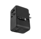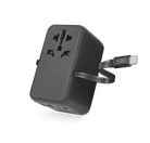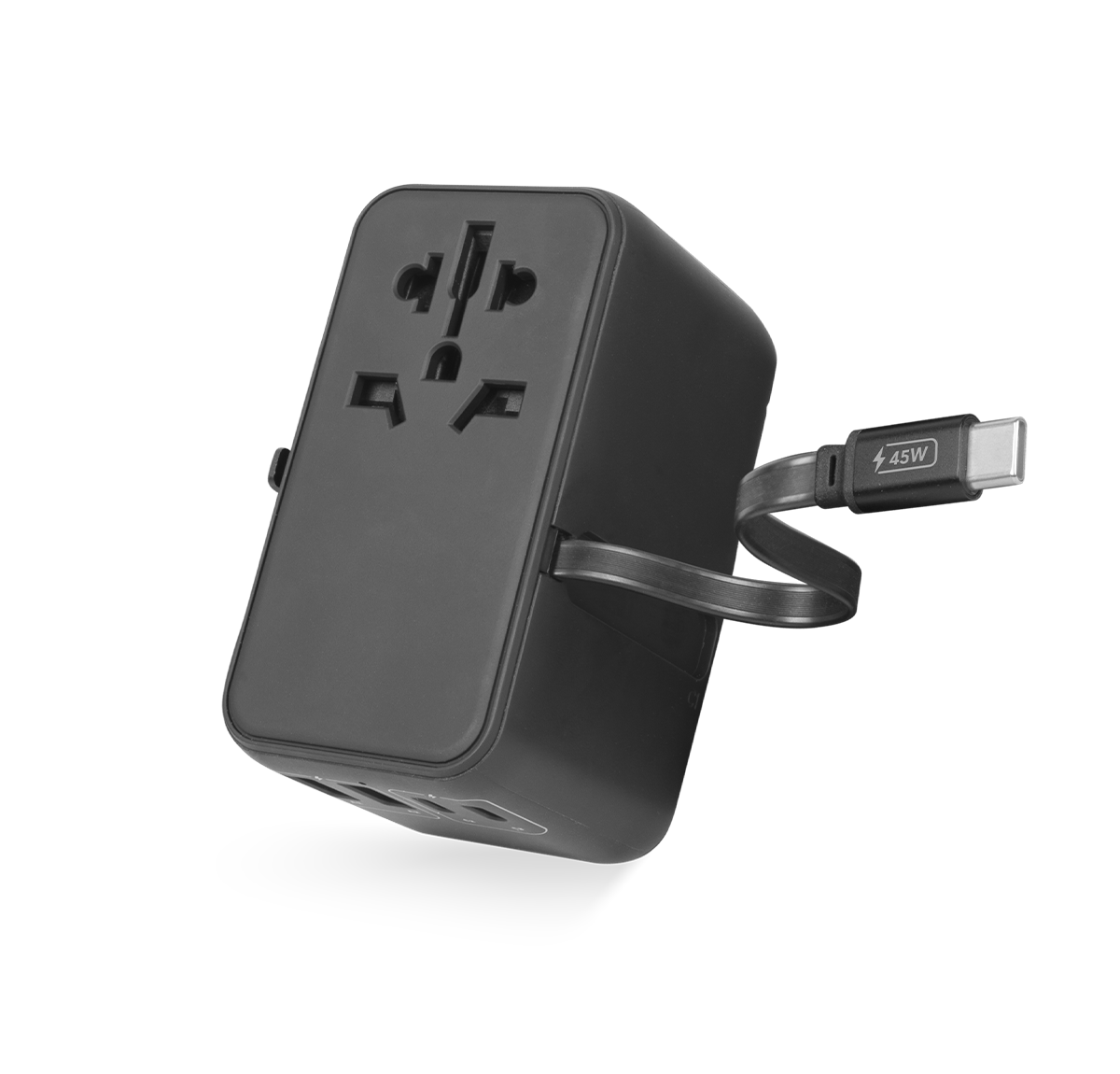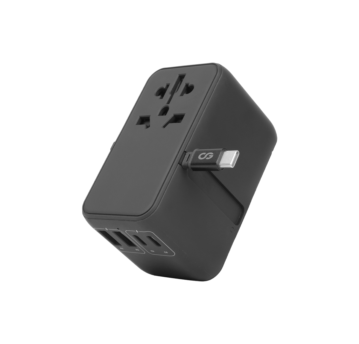 Fast Charging USB-A & USB Type-C Portable Universal Travel Adapter with built-in cable.